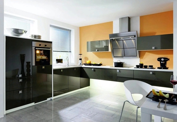 Идеальным фоном для гарнитура в современном стиле будут ровные стены, выкрашенные краской нейтрального цвета. Под темную мебель можно выбрать белый, бежевый, светло-серый тон, светлая красиво впишется практически в любую обстановку. Не рекомендуется выбирать обои с рисунком – лучше, чтобы текстура напоминала грубоватый камень или бетон. Для фартука, как правило, используется тонированное стекло либо небольшая керамическая плитка светлых оттенков.