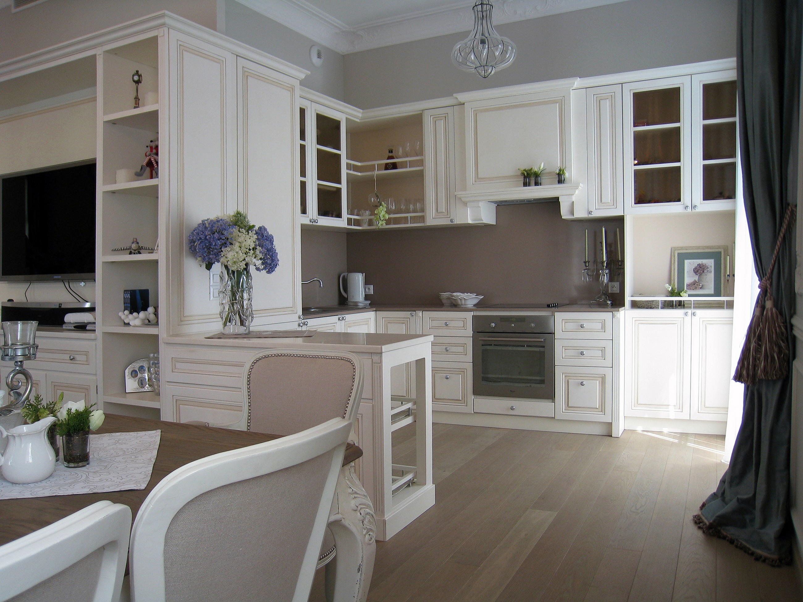 Немного потертая, украшенная резьбой и росписью прованская мебель вносит в интерьер кухни винтажный шарм и добавляет обстановке исторической ценности. Но, несмотря на «поживший» вид современные гарнитуры отличаются широким функционалом.