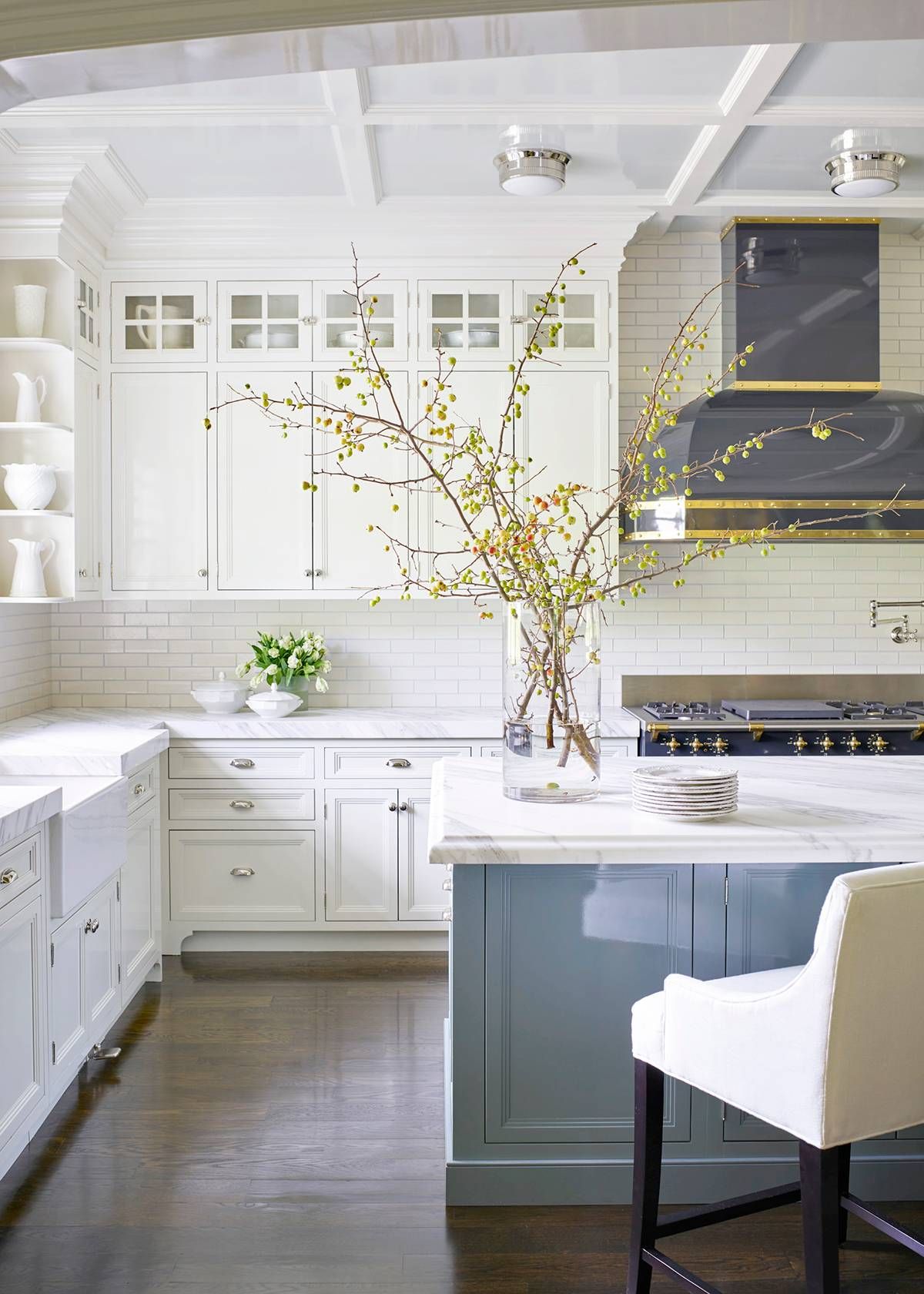 Прекрасный бирюзовый цвет был использован на стенах и вытяжке этой гладкой темной кухни с большим эффектом. От стеклянного шкафа до медной рейки, нам нравится, когда старое встречается здесь с новым.