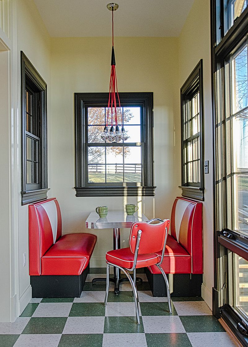 Создайте забавную будку для завтрака, установив виниловые будки вокруг кухонного стола. Винтажные обеденные часы, висящие над вашим холодильником или плитой, также будут свидетельством прошлого, оставаясь при этом современными. Не бойтесь использовать яркий поп-арт, например принт Энди Уорхола или дорожный знак.