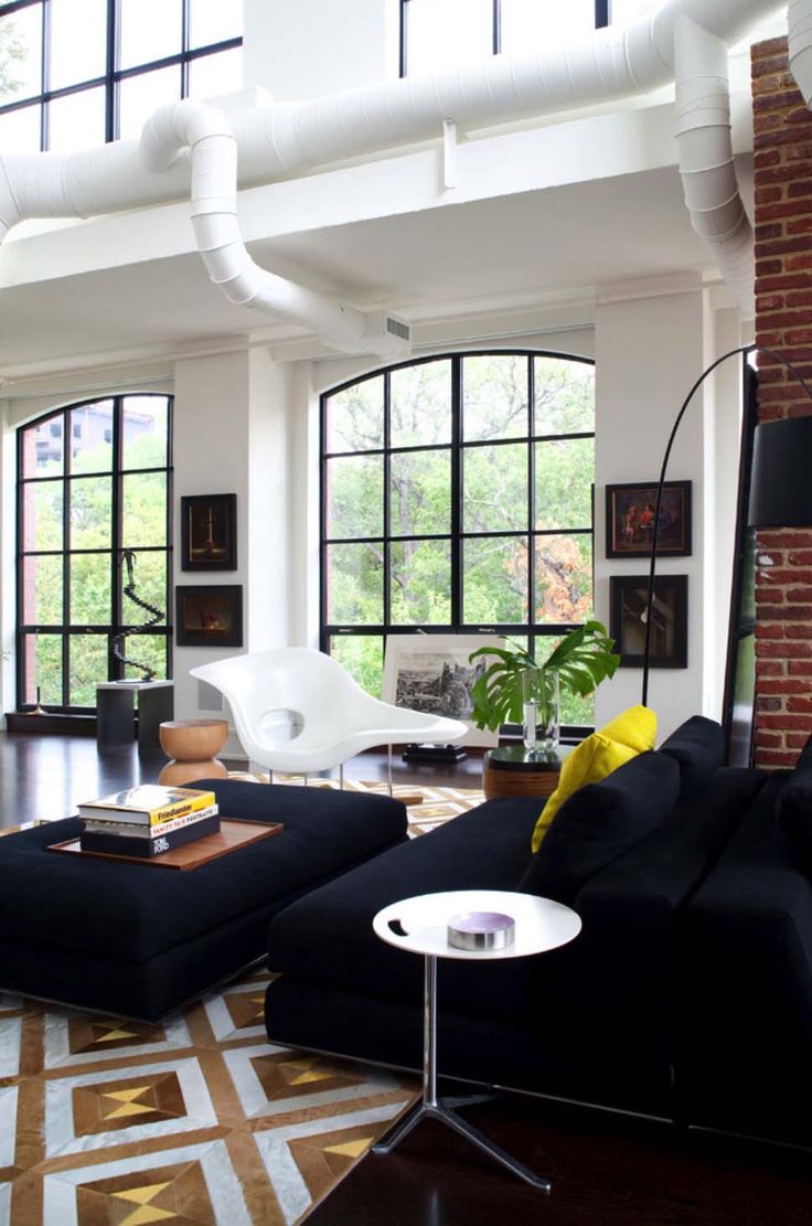 Характерные черты: отсутствие перегородок, кирпичная и бетонная отделка, современное искусство в качестве декора, наличие промышленных элементов. Мебель может быть разной – от винтажной и найденной на улице, а затем творчески переработанной, до простых удобных вещей нашего времени, главное – она должна быть оригинальной и яркой, чтобы не теряться на фоне огромного помещения. Окна при этом должны быть максимально большими.