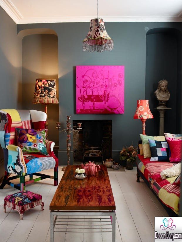 Так как гостиная визитная карточка дома, а стиль подразумевает калейдоскоп красок, важно не забывать про умеренность. Даже один диван из ярких лоскутков будет центром внимания. Не рекомендуется при оформлении гостиной использовать много декора, так как комната будет слишком цветастой, перегружая зрение.