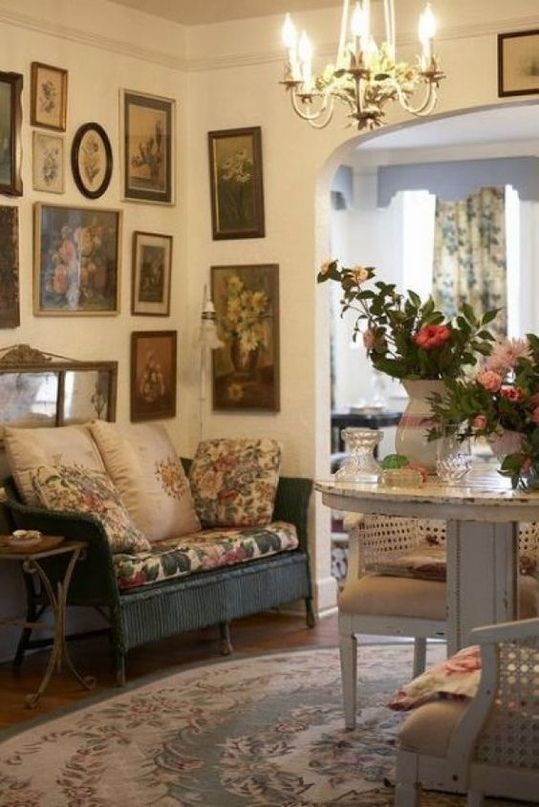 Весь декор выглядит чуточку изношенным, включая все предметы мебели и отдельные его детали. Часто сочетаются пастельные тона с антикварной мебелью, растительный орнамент с кружевом.