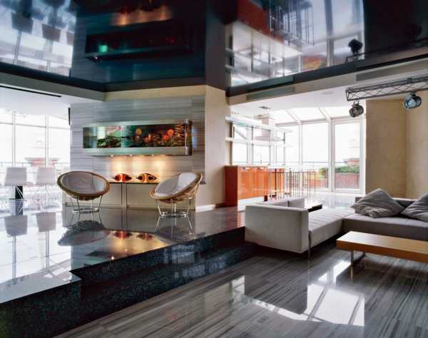 Потолки – одноцветные, гладкие, лучше натяжные. Внизу никаких узорчатых паркетов и, тем более, ковров: только плитка либо ламинат с системой «теплый пол» под ними.
