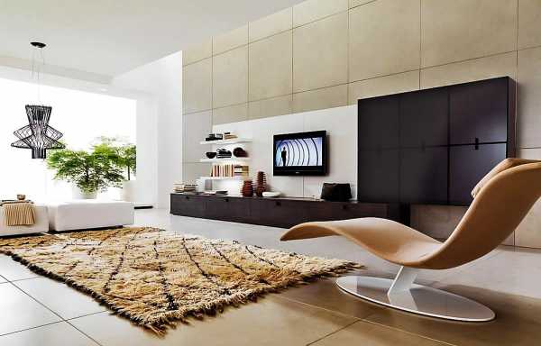 Длинный ворс на коврах и их яркие расцветки плохо сочетаются со стилем хай-тек. Зато хорошо смотрятся гладкое или глянцевое покрытие пола, однотонные обои или окрашенные стены и потолок.