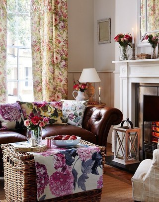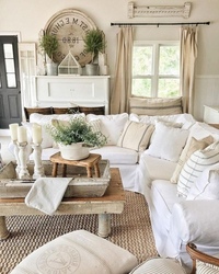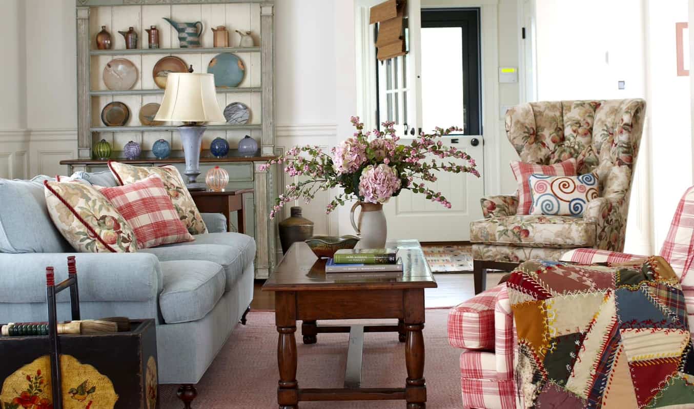 В гостиной уживаются очарование сельской жизни и элегантность прикладного искусства: роскошная люстра над добротным диваном, настенные росписи на фоне грубых оштукатуренных стен. Мягкая мебель в чехлах или обита тканью с цветочными узорами, много деревянных предметов. Появляется кованые элементы – люстры, горшки, подсвечники. Уют создается акцентами – картины с изображением лугов, текстиль, декоративная керамика, свежие и сухие цветы.