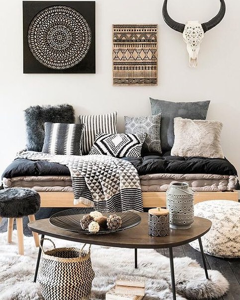 Акцент сделайте на предметах, которые не только украшают дом, но и являются функционально значимыми. Чехлы для мебели, диванные подушки, коврики и разнообразные элементы декора придадут интерьеру индивидуальность. Цвета, узоры и фактура могут быть совершенно любыми, но предпочтение отдается ярким геометрическим принтам.