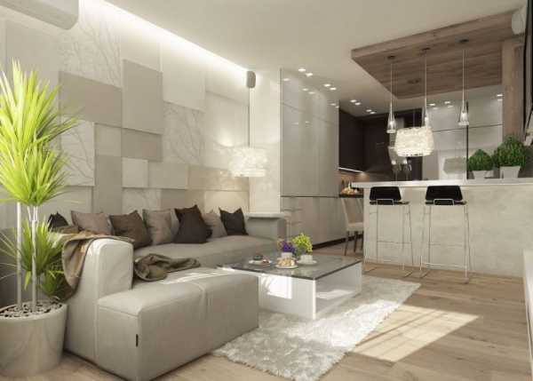 Это очень логичный вариант – в гостиной принимают друзей, отдыхают, не обходится и без чаепития или праздничных застолий. Достаточно лишь визуально отделить зону приготовления пищи барной стойкой, а с другой стороны поставить диван, телевизор, стенку – и получится комфортная многофункциональная студия.