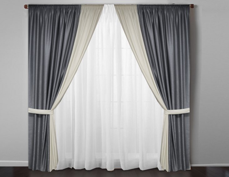 - Из-за особенностей серого цвета, который богат оттенками от белого до чёрного, портьерные ткани этой гаммы не рекомендуется дополнять узорами. Лучше создавать объемную фактуру материала, драпировки.