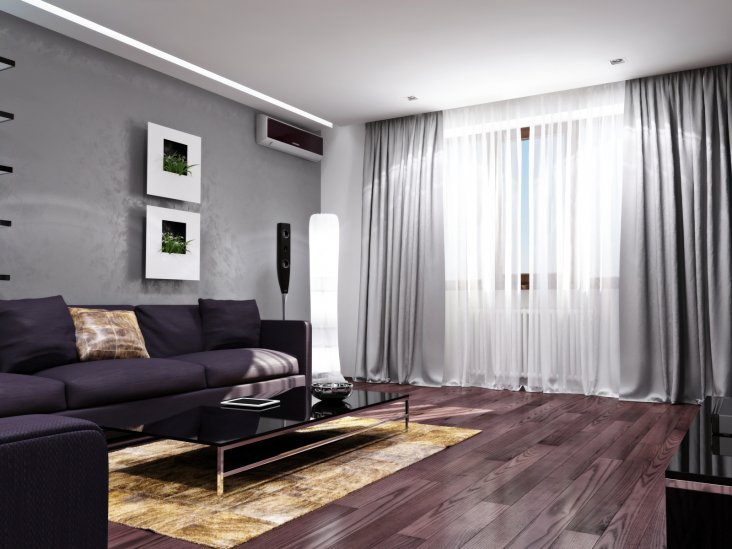 Органично портьеры однотонных серых тонов вписываются в помещение, выполненное в зеленой, сиреневой, лиловой или бордовой гамме. Планировка и размеры комнаты особого значения не имеют.