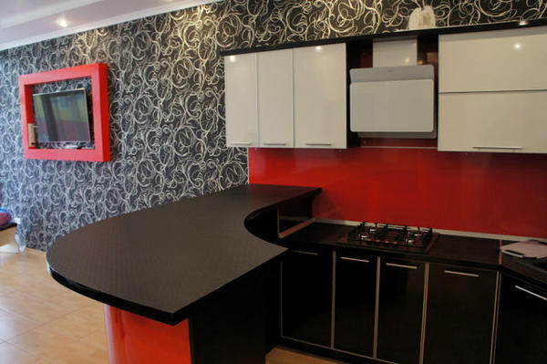 Современный интерьер кухни, черный, красный и белый Кухонные обои: нотки радости в интерьере | 5/19
