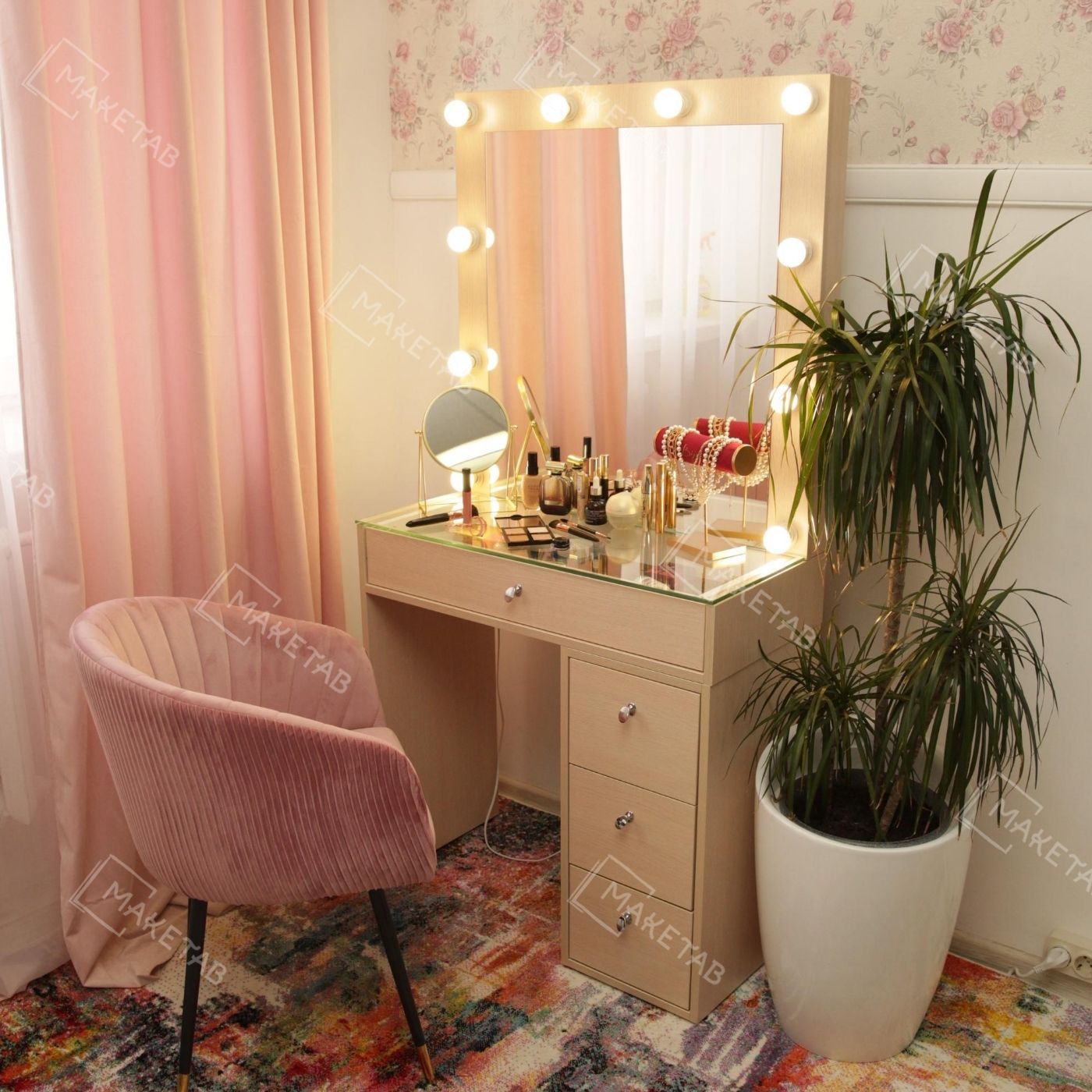 Без зеркала никак не обойтись! На столике оно обязательно должно быть. Как вариант, это может быть маленькое зеркальце на ножке. Все зависит от потребностей и предпочтений девушки. Традиционным практичным решением считается трельяж либо гримерное зеркало с софитами.