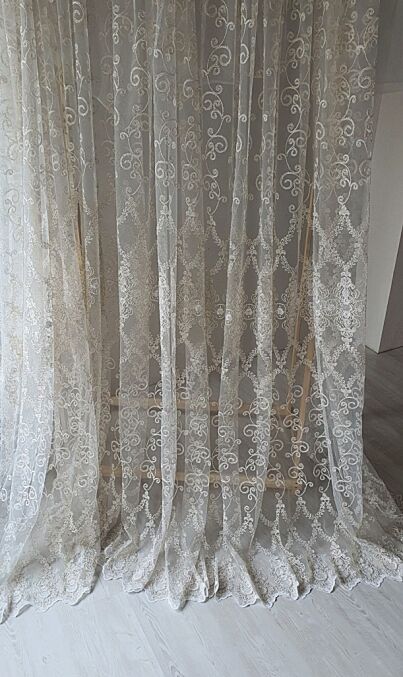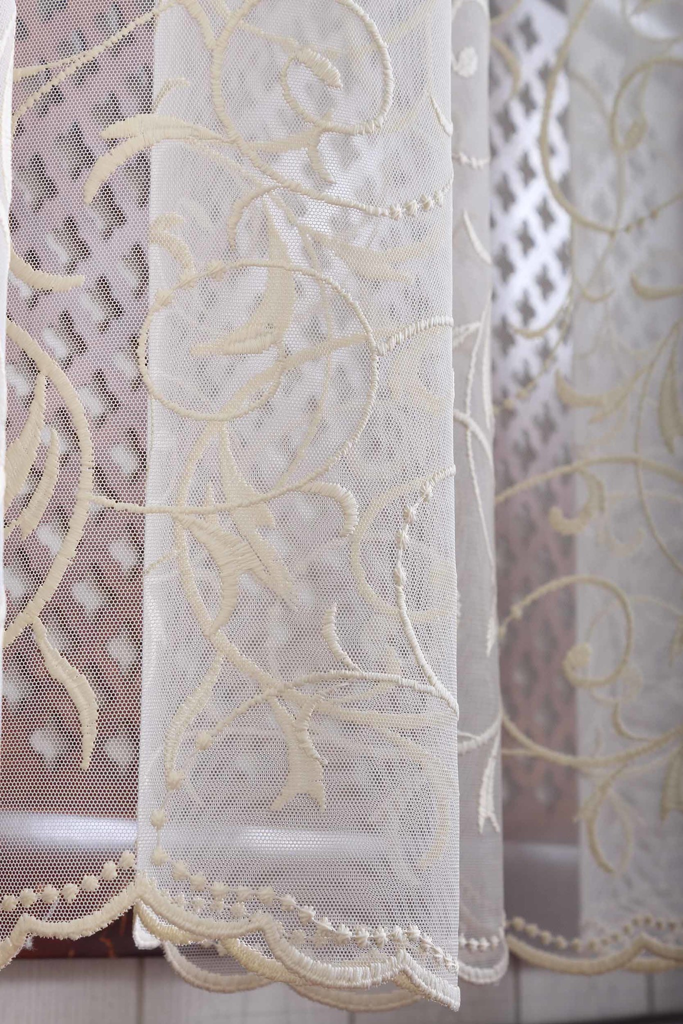 Тюль может совпадать или не совпадать по оформлению и цвету с нитями вышивки. Ткани различаются между собой характером вышивки, используемыми нитками, размером ячеек.