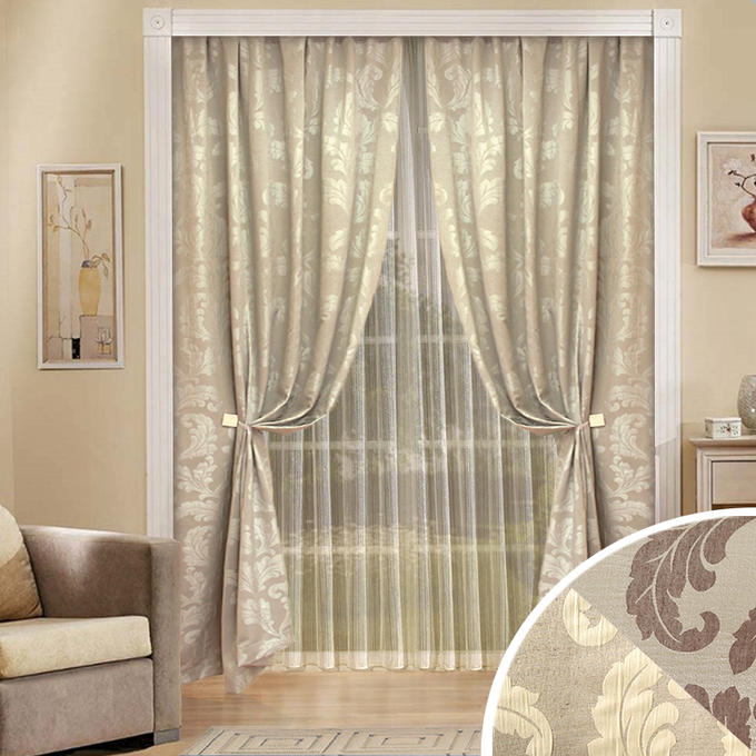 Органза деворе хорошо смотрится с однотонными тяжелыми портьерами на 2-3 тона темнее. Важно следить, чтобы на шторах не было заметного рисунка, иначе это перегрузит композицию.