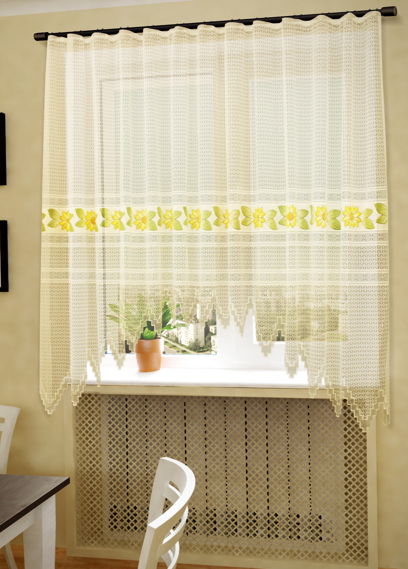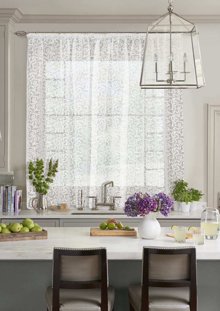 Такие занавески не просто так вешают на кухне. Нежная и воздушная ткань уместно смотрится в рабочем пространстве, где при всём желании не повесить тяжёлые шторы из плотной ткани – смотреться это будет глупо.