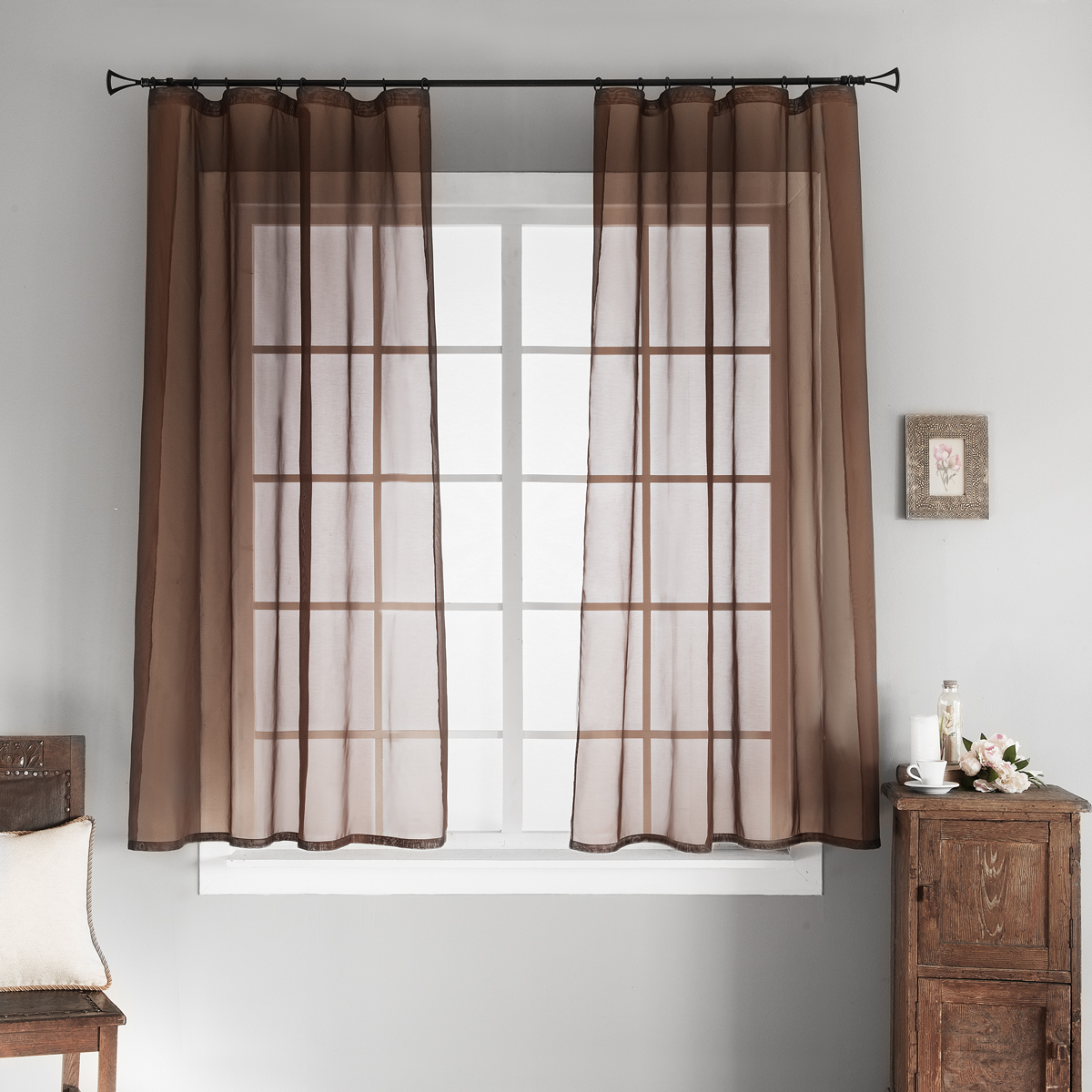 Светлый продукт отлично подойдет к темным портьерам. Решение считается универсальным, и будет оставаться актуальным и модным еще долгие годы.Сочетание разных оттенков позволит добиться уникального эффекта. Необходимо учитывать общий дизайн и гармонию цветов между собой. - Темный тюль в романтическом стиле.
