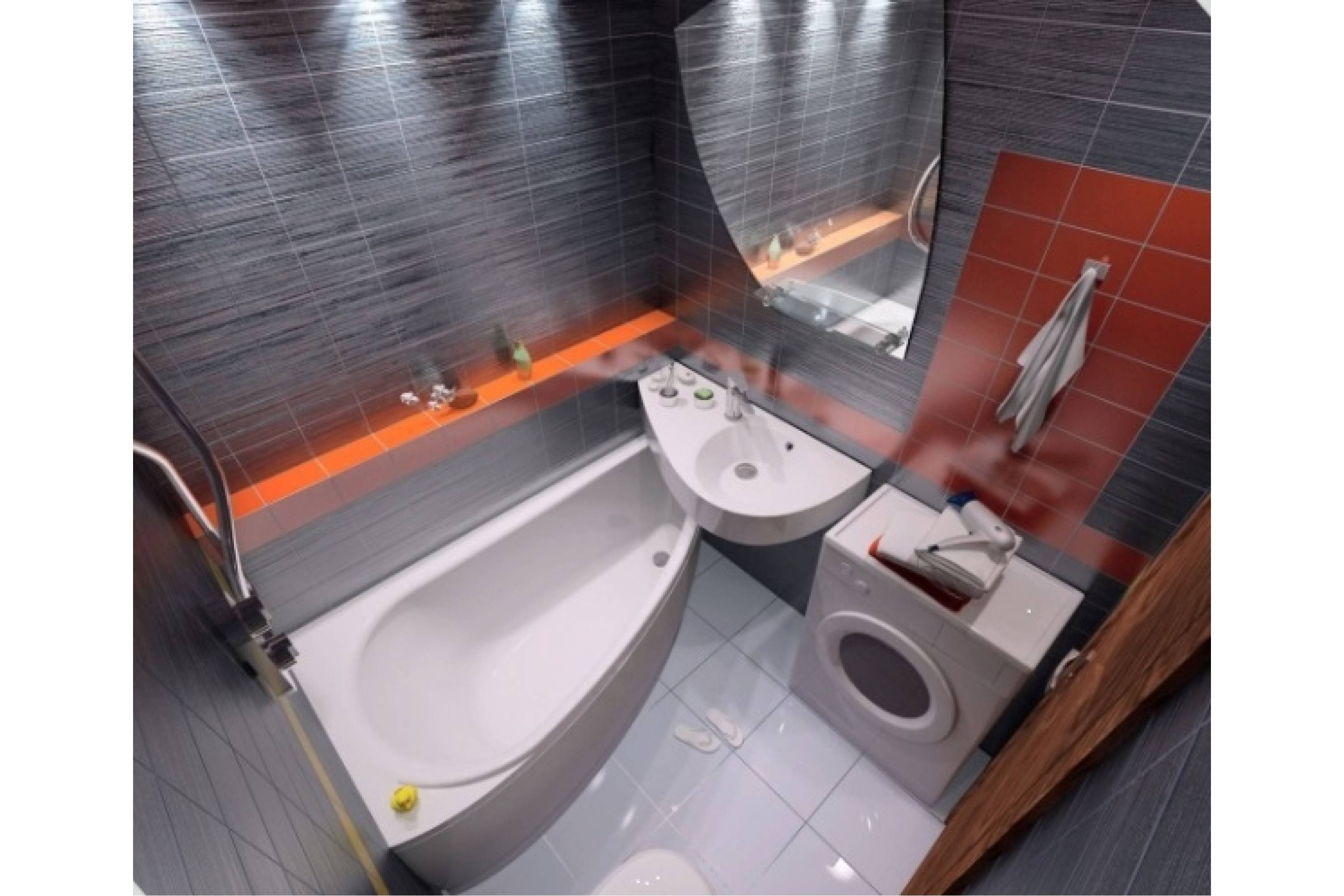 Такое размещение позволяет сэкономить достаточно места, которого будет достаточно для размещения умывальника, стиральной машины и мебели (шкафчика) для разной бытовой химии и мелочей. Именно поэтому угловые ванны особенно востребованы в ванных комнатах небольшой площади.