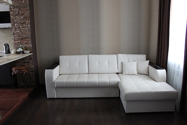 Следующий вариант также популярен. Он заключается в обустройстве светлой комнаты таким же светлым угловым диваном. Но стоит учесть, что полностью белая комната не всем придется по вкусу. Поэтому ее желательно разбавить яркими или контрастными элементами декора. Это могут быть шторы, картины, мелкая мебель, яркие диванные подушки и прочее. Без этих элементов комната будет чересчур светлой и однообразной.
