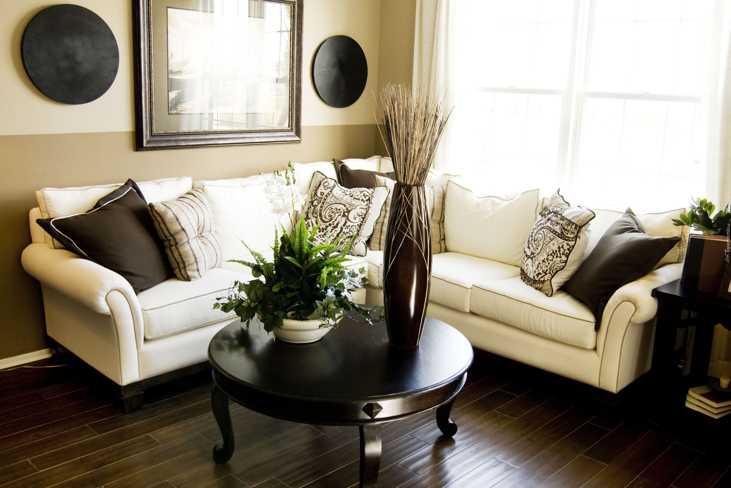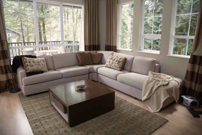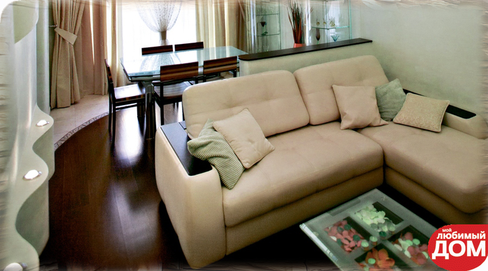 - Стильный лаконичный ансамбль получится, если поставить бежевый Г-образный диван с темными подлокотниками в комнате с кремовыми стенами и темно-коричневым полом, выложенным ламинатом. Напротив мягкой мебели найдет свое место стеклянный кофейный столик и белый ворсистый ковер. Над диваном следует повесить монохромные картины небольшого размера.
