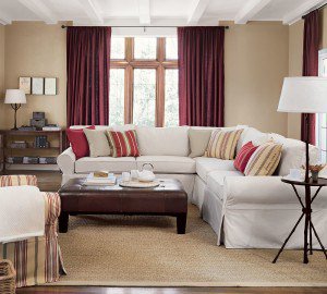 - Яркий диванчик красного цвета можно поставить в комнате с кремовыми стенами и светлым ламинатом. Напротив мебели следует поставить деревянный столик рыжего оттенка и постелить на пол ворсистый коврик коричневого цвета.