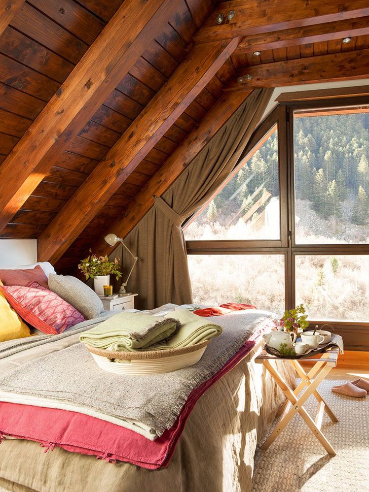 Открытые деревянные балки и эклектичный лоскутный ковер наполняют это убежище бесконечным теплом.