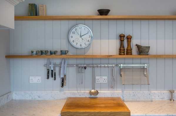 Используют вагонку и в рабочих участках, то есть на «фартуке». Если доска обработана антисептиком и покрыта влагостойкой краской для кухни, уход за поверхностью фартука не является проблемой.