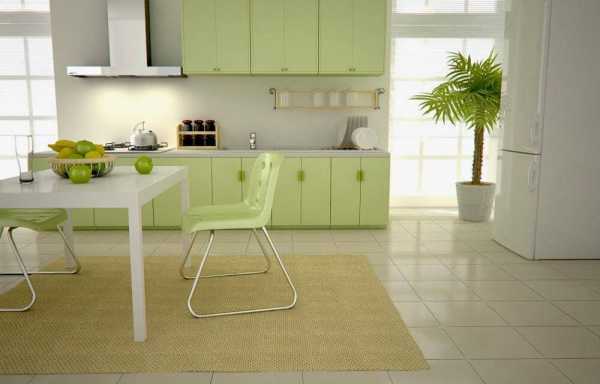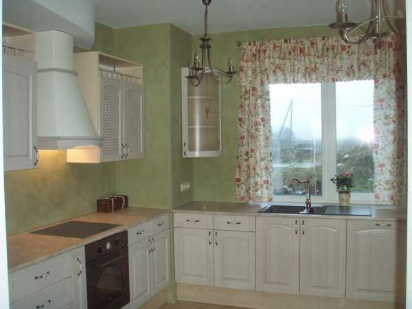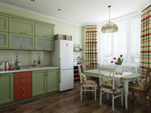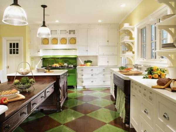 Данная комбинация будет актуальной и для стиля «прованс». Белыми могут быть стены на кухне, бытовая техника и пол из керамической плитки. Кухонный гарнитур можно смело красить в зеленый цвет.