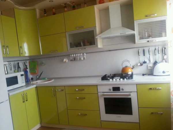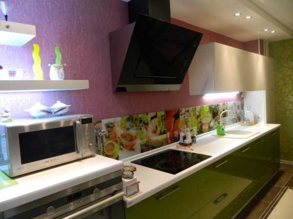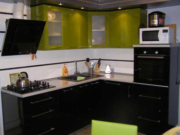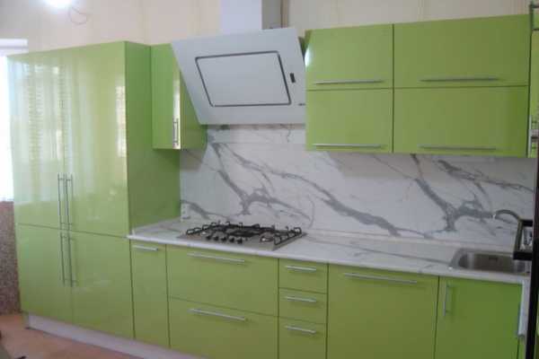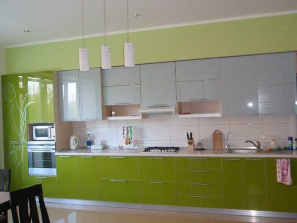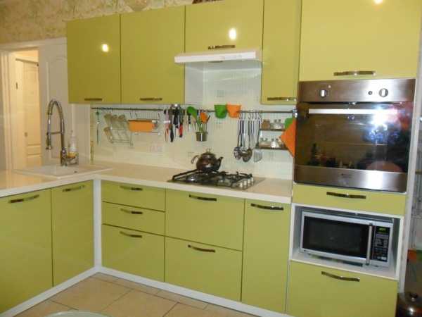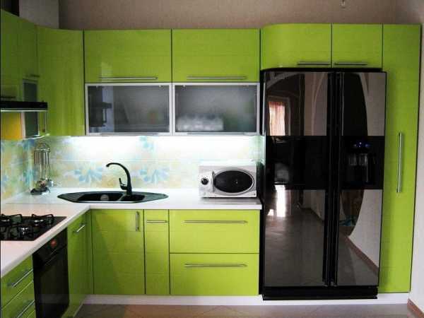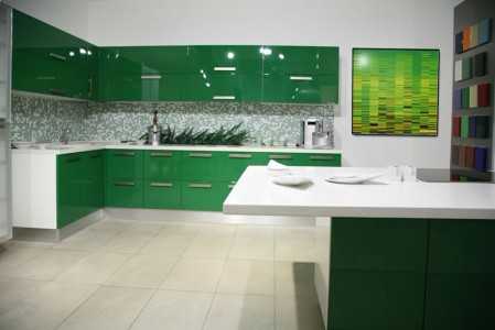 Чтобы обустроить такой интерьер, достаточно установить на кухне современный гарнитур из пластика с фасадами зеленого цвета.
