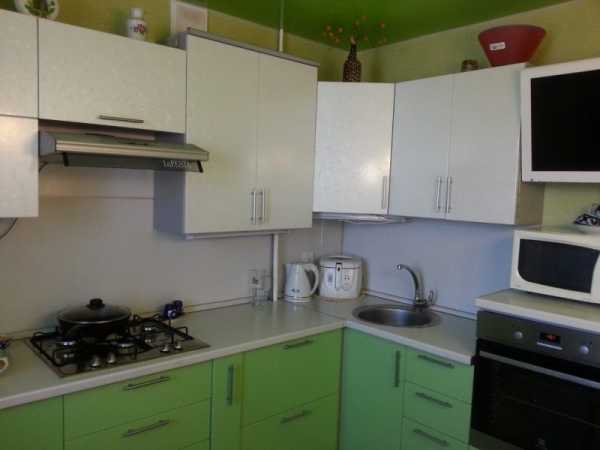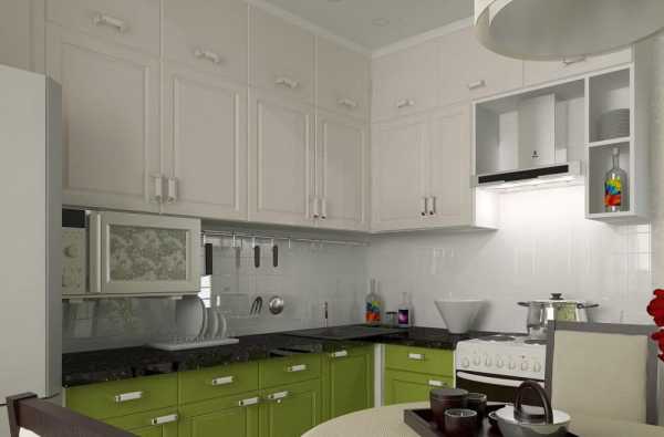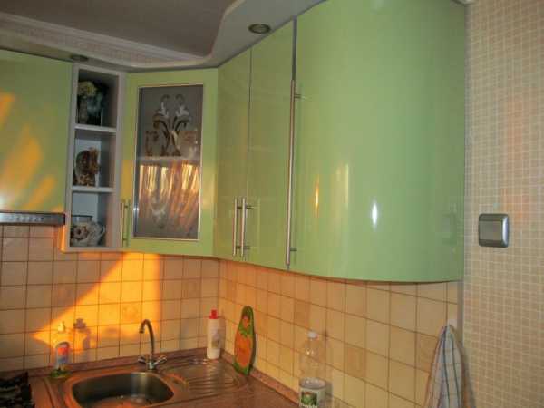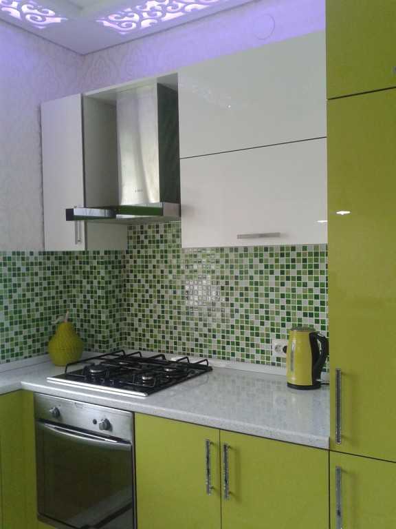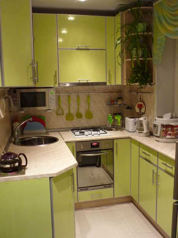 Небольшой кухне подходят светлые оттенки гарнитура: нежно-зеленый, фисташковый. Темные оттенки кухонной мебели в миниатюрном помещении могут создать угнетающую обстановку. При этом учитывайте то, что зеленый гарнитур подходит белым или бежевым стенам.
