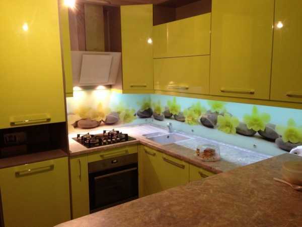 Особого внимания при разработке дизайна требует угловая кухня. Если оттенок мебели достаточно темный, следует организовать яркую подсветку рабочей зоны. Скинали рядом с угловыми гарнитурами ставят так, чтобы узор был завершенным при взгляде на каждую из частей.