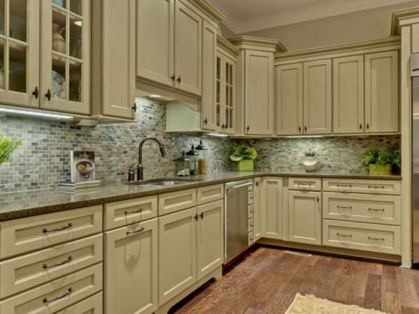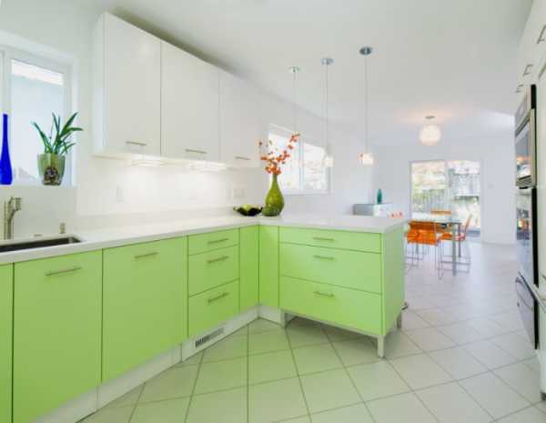 Зеленый низ — нижние зеленые фасады гарнитура могут быть выполнены в каждом вышеописанном стиле. Цвет пола при этом может быть нейтральным, либо контрастным — черным, бежевым, коричневым. Можно также использовать в качестве покрытия керамическую плитку темно-зеленого цвета.