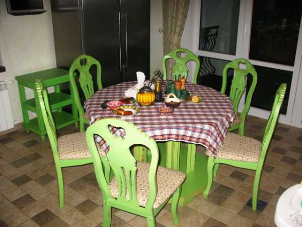 Если в травяной окрасить кухонный гарнитур (или его нижнюю часть), то стены должны быть нейтральными. А обеденные стулья и стол лучше выбрать простые деревянные. Здесь уместны как светло-коричневые предметы мебели, так и темные модели. И это обычно самые яркие пятна в интерьере кантри.