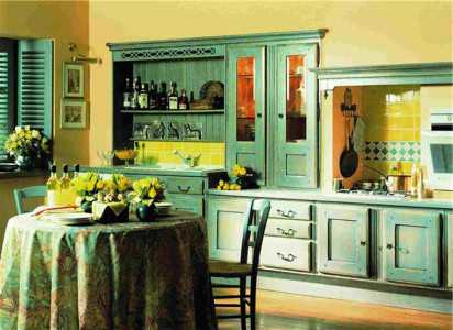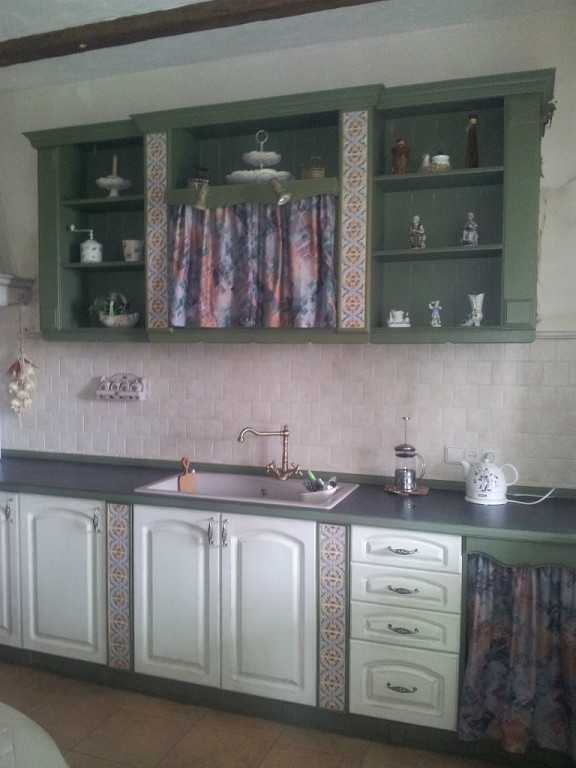 Для реализации идеи можно установить в помещении деревянный гарнитур в деревенском стиле, покрашенный в бледно-зеленый либо насыщенный зеленый цвет. На его полки следует расставить красивую керамическую посуду, бытовую технику рекомендуется спрятать за фасадами.