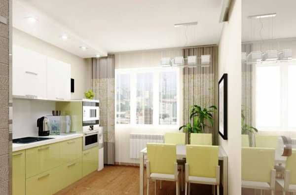 Здесь кухонный гарнитур может быть выполнен в достаточно ярко-изумрудном и даже лимонном цвете. Оформление остальной части помещения использует чаще всего светлые материалы. Но обеденные стулья и стол предпочтительны в натуральном древесном оттенке.