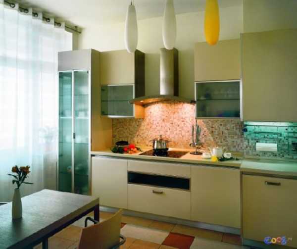 Оптимально выдерживать нейтральный тон во всем: шторы, скатерть, занавески на полках – все это лучше выполнить из льна, в тот же цвет следует окрасить стены. Или же для стен выбирают фисташковый оттенок, тогда гарнитур будет нейтрально молочным, кремовым или бежевым.