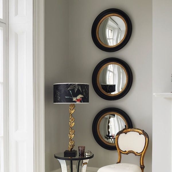 Сегодня можно найти специальные панно из нескольких фрагментов, которые заранее подготовлены для декорирования поверхностей. Они бывают в форме квадратов и прямоугольников, ромбов, шестигранников, кругов. Можно и самостоятельно собрать оригинальное панно из отдельных полотен. В качестве рам используют, например, настенные молдинги. Тогда зеркала напоминают картины.
