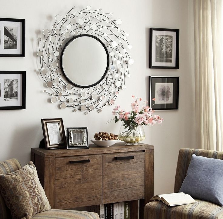 - Просто сделать красиво. Зеркало вполне может выступать и как самостоятельный элемент декора. Например, для акцентной стены в гостиной или над изголовьем кровати.