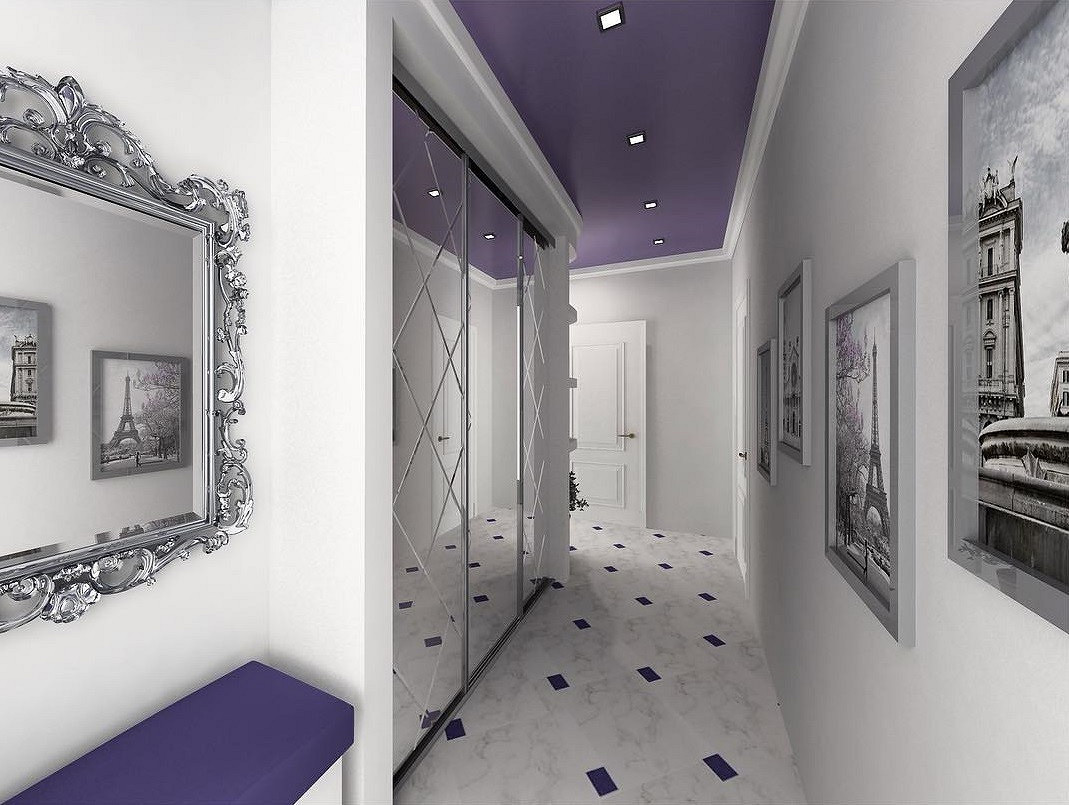 В узком коридоре приветствуется глянцевый светлый пол и отражающая поверхность потолка. Чтобы добиться увеличения площади коридора, желательно пол и потолок подобрать в едином цветовом решении.