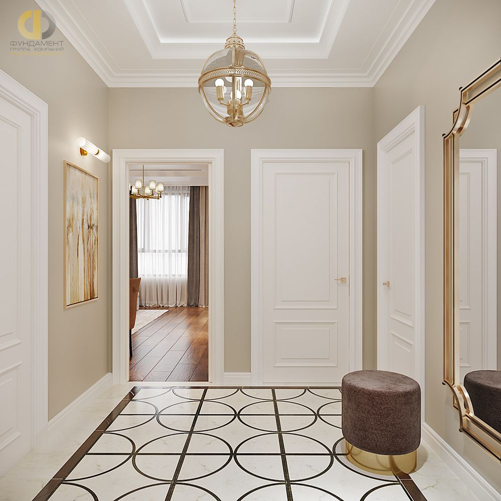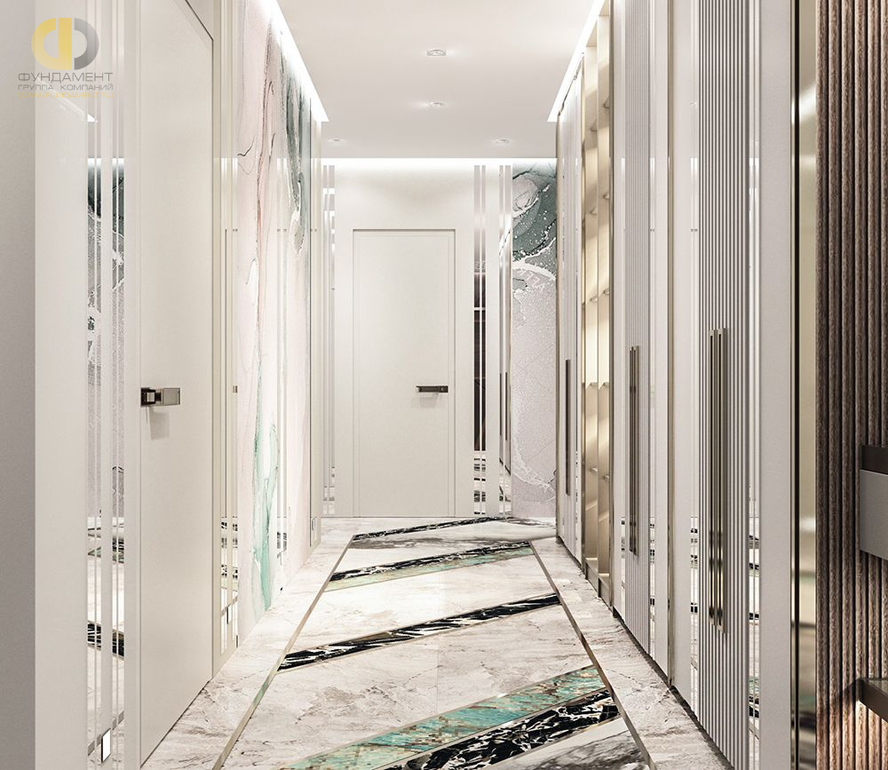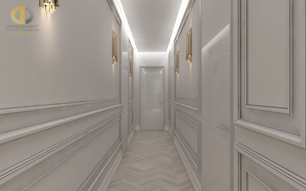 Если коридор является логическим продолжением прихожей, без переходов, отделку лучше выбирать одинаковую на всем протяжении.