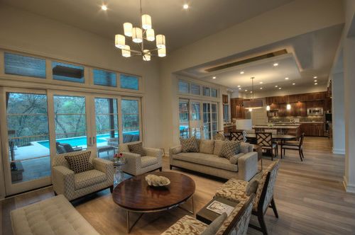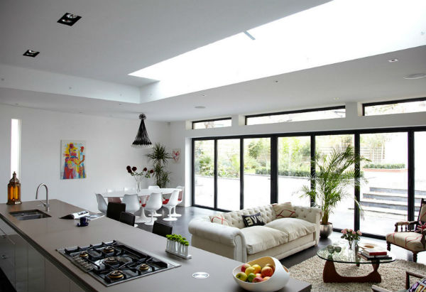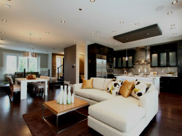 В частности, люстру можно использовать в области зала, в то время как достойно осветить место приготовления еды помогут встроенные светильники.
