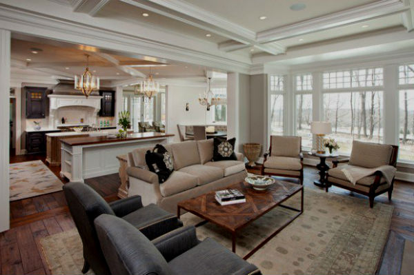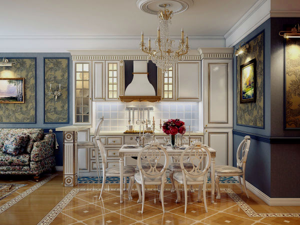 Хорошо подойдет классика для кухонь, совмещенных с гостиной. Фото демонстрируют идеально четкие линии, дорогую деревянную мебель, отсутствие лишних деталей и однотонные светлые стены.
