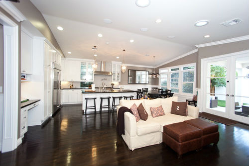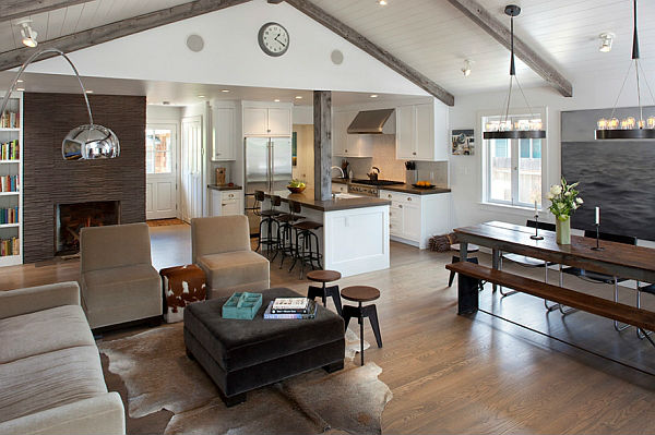Чтобы выделить зону кухни и гостиной можно задействовать разные оттенки одного цвета или же кардинально разные тона. Скрыть границу перехода поможет небольшая арка или ряд точечных светильников.