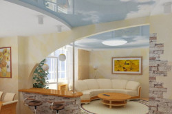 Одна из самых больших проблем городских квартир, построенных еще в советские времена – их малогабаритность. Небольшие комнаты, маленькая прихожая и мизерная кухня. Поэтому многие хозяйки при ремонте принимают решение соединить кухню и гостиную. А обладатели квартир в современных новостройках, напротив, получают при покупке большое, уже совмещенное пространство кухни и гостиной. Им всем хочется правильно оформить такое пространство и грамотно разделить его на зоны с разной функциональностью, а также выбрать потолочные покрытия, чтобы они гармонично влились в общий стиль оформления помещения.