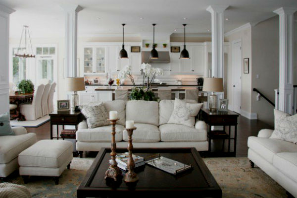 Иногда вместо сноса стен достаточно расширить дверной проем, сделав широкое арочное пространство любой формы. Вместо арок и стен можно использовать небольшие колонны, которые не только разделят пространство, но и будут нести смысловую нагрузку в помещении классического стиля. Зонирование пространства светильниками наиболее интересный вариант оформления.