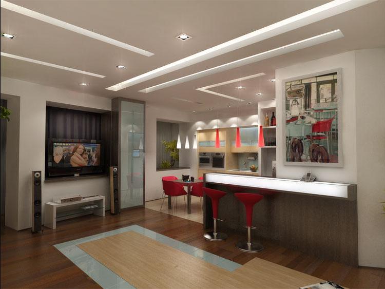 Фото дизайна потолка гостиной, совмещенной с кухней, помогают понять, как изменяется интерьер, благодаря освещению. Сочетание яркого и приглушенного света, использование разных видов светильников вполне подходят для разделения пространства на функциональные зоны. С помощью стационарных или поворотных софитов легко осветить рабочую поверхность на кухне, выделить барную стойку или обеденный стол, провести границу между гостиной и кухней.