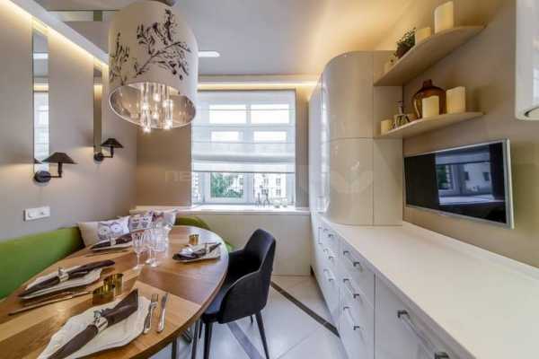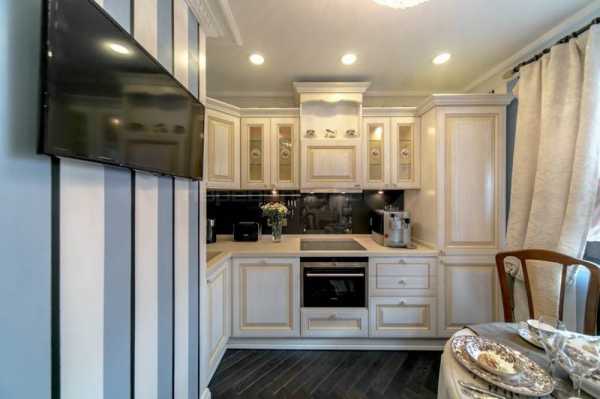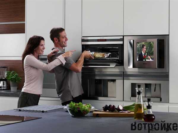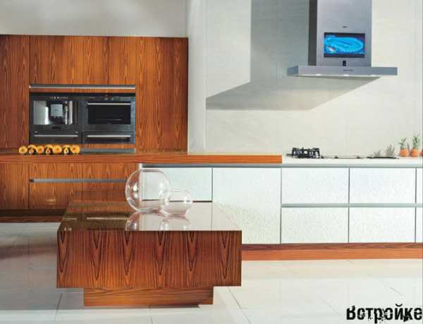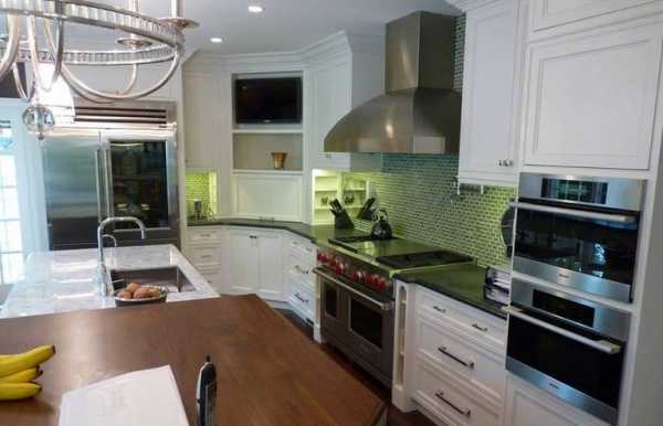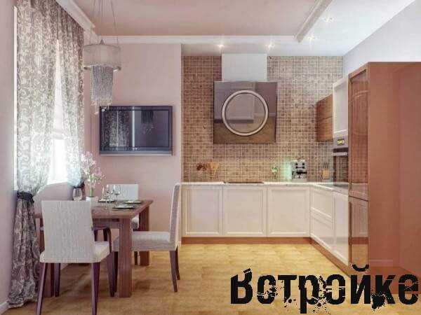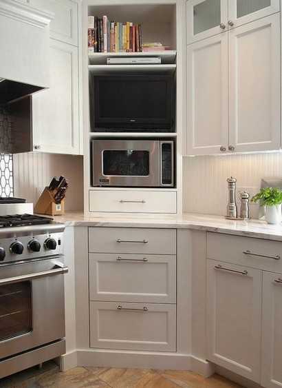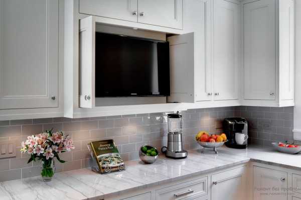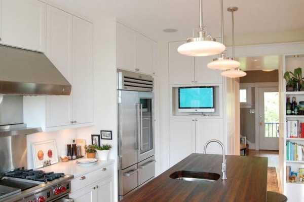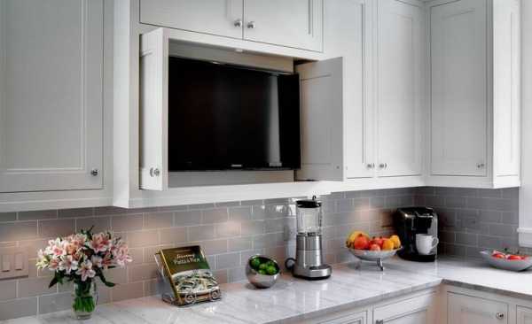 - встроенный телевизор – на этапе покупки (или заказа) кухонного гарнитура предусмотреть нишу (шкафчик), куда вставить телевизор. При этом важно подобрать место так, чтобы при открывании дверец соседних шкафов их ручки не задевали экран. Еще один вариант – навесной шкафчик, размещенный в углу, в него хорошо впишется некрупный ЖК-телевизор
