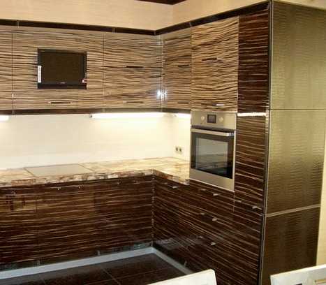 - Угловая Г-образная кухня, в которой размещен телевизор – либо стационарный в нише, либо в той же нише телевизор на кронштейне;