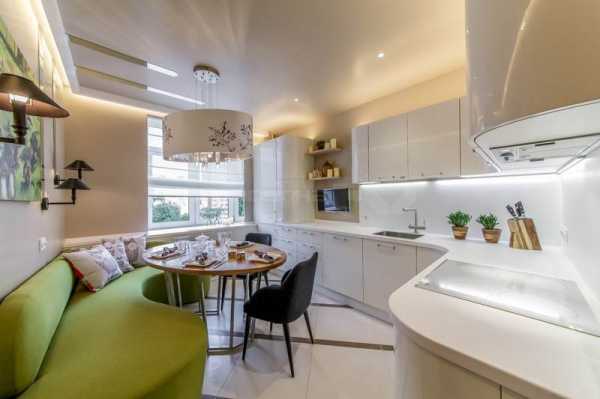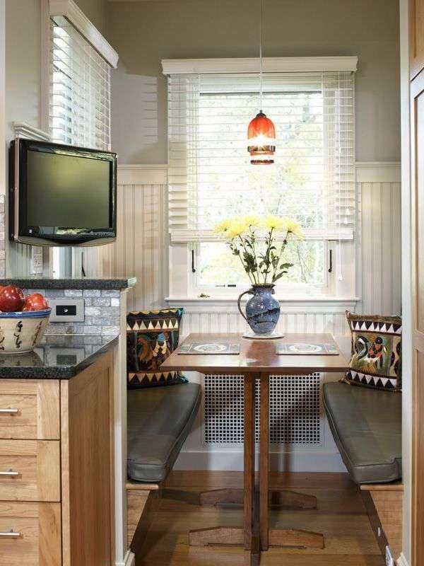 - На противоположной стороне диванный уголок с кухонным столом, при этом диван тоже может быть угловым с заворотом к окну;