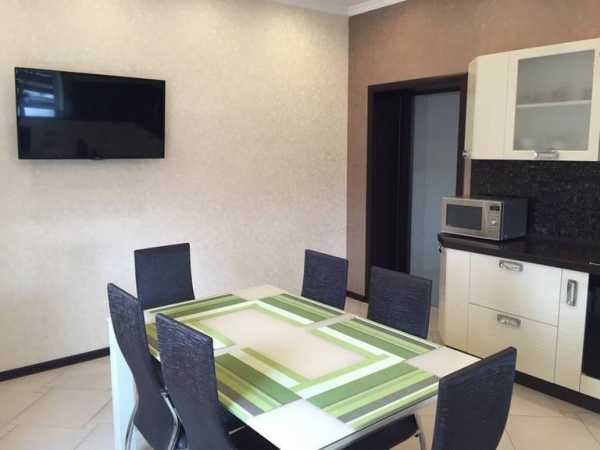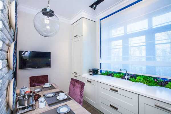 - В кухне, объединенной с гостиной, или квартире-студии нет строгих ограничений в размерах техники, и телевизор с диагональю в 40 дюймов уместен, вопрос в том – где его лучше разместить.