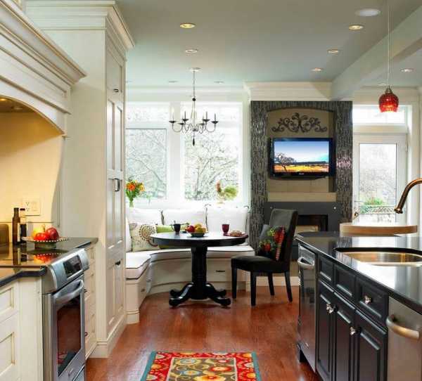 В просторной кухне в загородном доме разместите телевизор над настоящим или фальш-каминомПеред покупкой стоит задуматься о компактном расположении, т.к. вариантов размещения на кухне небольшой площади не так уж и много. Позаботьтесь и о эстетической составляющей.